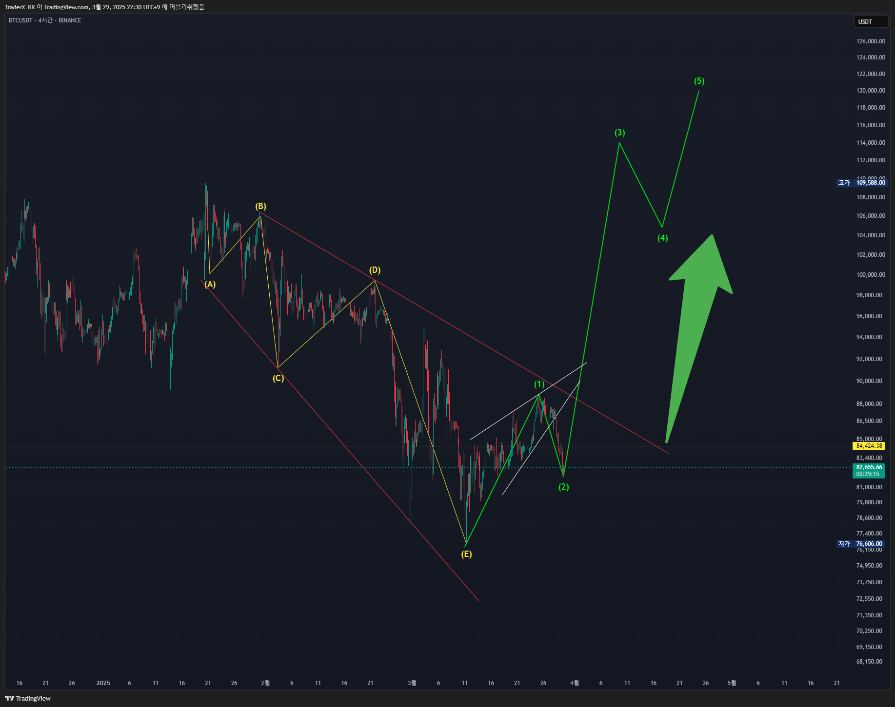 현재 비트코인은 상승 흐름을 이어가고 있으나, 명확한 돌파 없이 박스권 내에서 조정을 반복하고 있습니다. 눈에 띄는 급등보다는, 오히려 복합적인 조정 파동처럼 보이는 흐름이 이어지고 있습니다.