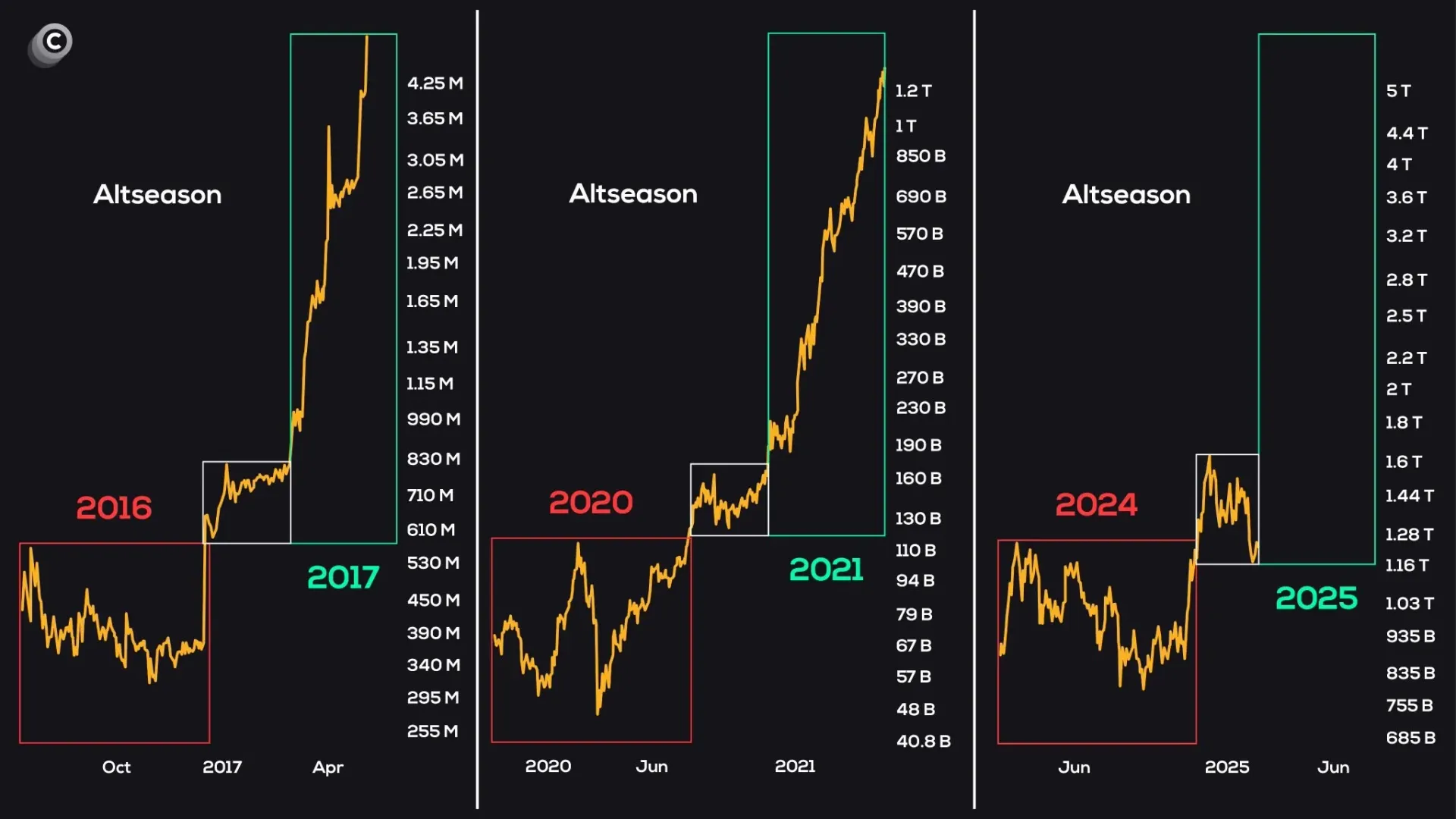 - 2024년 횡보 및 조정 - 2025년 초, 이전과 유사한 구조 출현 - 현재는 알트시즌 초입 구간일 가능성