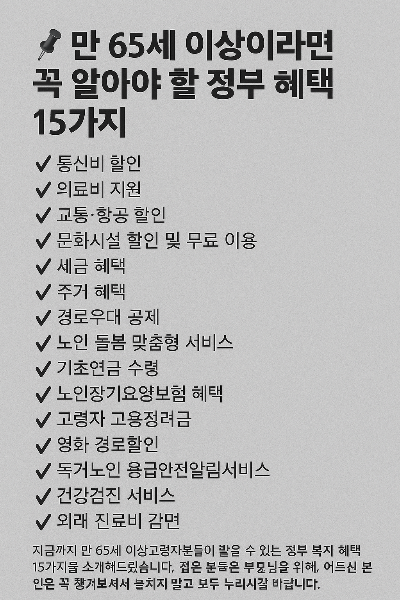 ์ง๊ธ๊น์ง ๋ง 65์ธ ์ด์ ๊ณ ๋ น์๋ถ๋ค์ด ๋ฐ์ ์ ์๋ ์ ๋ถ ๋ณต์ง ํํ 15๊ฐ์ง๋ฅผ ์๊ฐํด๋๋ ธ์ต๋๋ค.